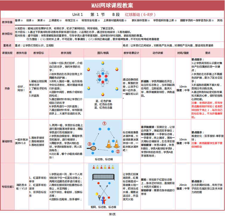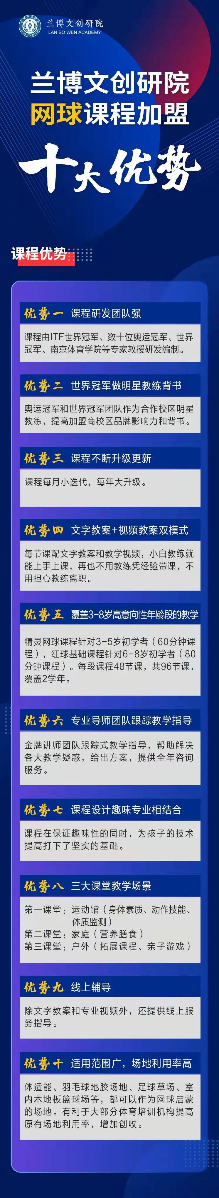 网球的教案研发团队强大:主要由ITF世界冠军、数十名奥运冠军、世界冠军、南京体育学院专家教授研发编制;并且邀请世界冠军做明星教练背书:奥运冠军、世界冠军团队作为校区明星教练,提高加盟商校区品牌影响力和背书;课程不断升级更新:课程每年大幅度升级;文字教学+视频教案双模式:每节课配置文字教案和教学视频,小白教练轻松上手,再也不用教练凭经验授课,机构不用担心教练离职;课程覆盖年龄3-8岁高意向年龄段:精灵网球课程针对3-5岁初学者(60分钟课程),红球基础课程针对6-8岁初学者(80分钟课程)。每段课程48节课,共96节课,覆盖两个学年;适用范围广,场地利用率高:体适能、羽毛球地胶场地、足球场地、室内木地板篮球等,都可以作为网球启蒙的场地。有利于大部分体育培训机构提高原有场地利用率,增加创收。