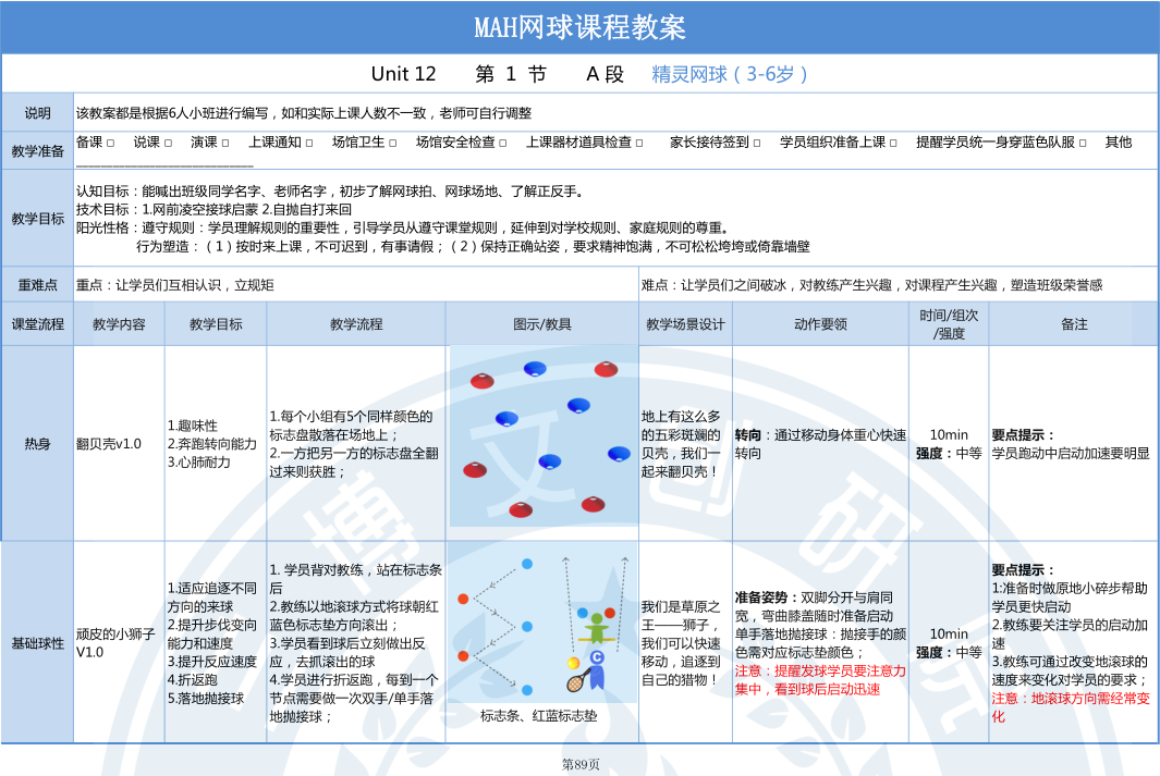 通过我们的这套教案,将机构遇到的痛点问题逐个击破!依据教案直接磨课,全年课程轻松搞定,大大减少精力和时间投入,降低用人成本;课程标准化、体系化,所有教练按照教案上课,学员不再只认教练;教学复刻,方法统一,考核有了既定标准;研发团队不断精进优化,始终保持教案的先进程度,与国际接轨;丰富的游戏结合全面的技术训练,寓教于乐,学员兴趣浓厚,参与度大大提高。