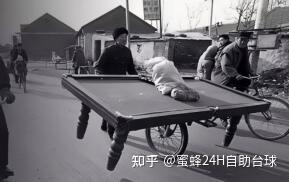 上图—90年代用独轮车推着台球桌去露天摆设
