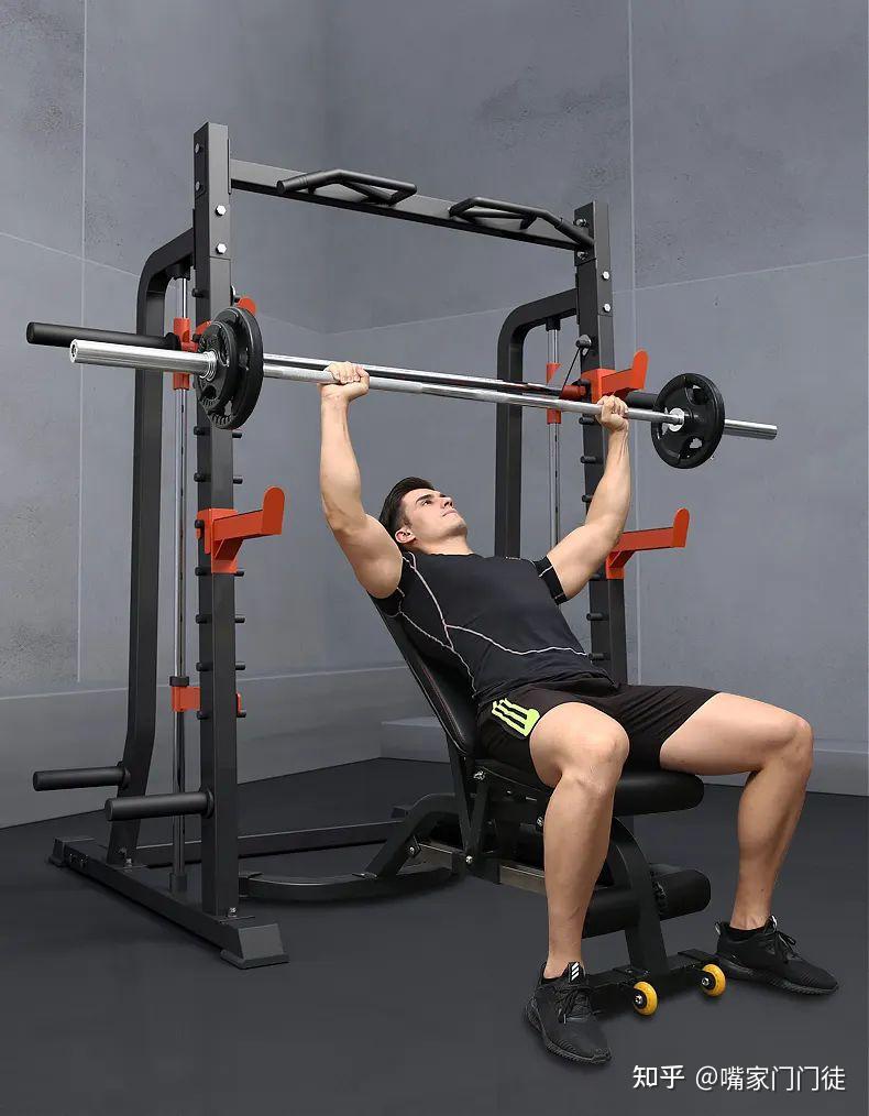 :史密斯架算是健身房的标配之一,史密斯架的特征是限制了杠铃的滑动轨迹,不管是做深蹲还是推举的时候训练者都不用担心杠铃的前后突发摆动,史密斯架的功能非常多,最常见的就是深蹲以及不同姿势的卧推(上斜、平板、下斜),除此之外,史密斯架还可以做俯姿划船,肱二头弯举、举踵等等,可以说史密斯架是一台综合性健身器材