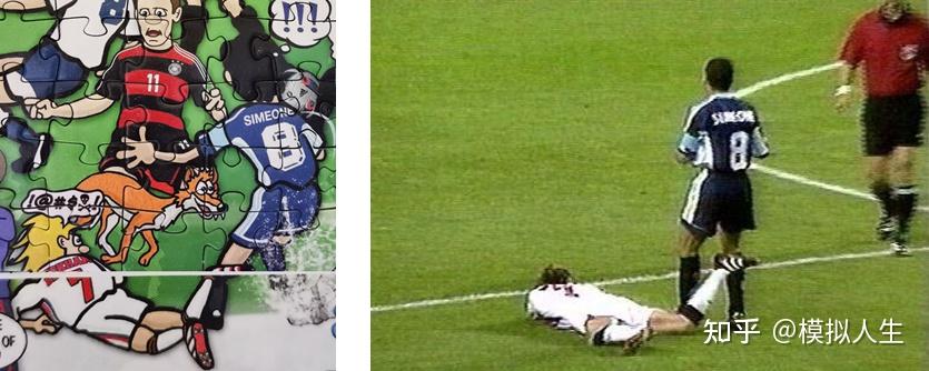 在1998年法国世界杯上,英格兰对阵阿根廷,下半场开始波澜不惊,但过了没多久,在中圈附近,西蒙尼对贝克汉姆犯规,丹麦裁判也给了西蒙尼黄牌,但是年轻气盛的贝克汉姆做了一个非常不必要的动作,在裁判眼皮底下用脚故意勾倒西蒙尼(当然西蒙尼也有表演成分,表情痛苦)。