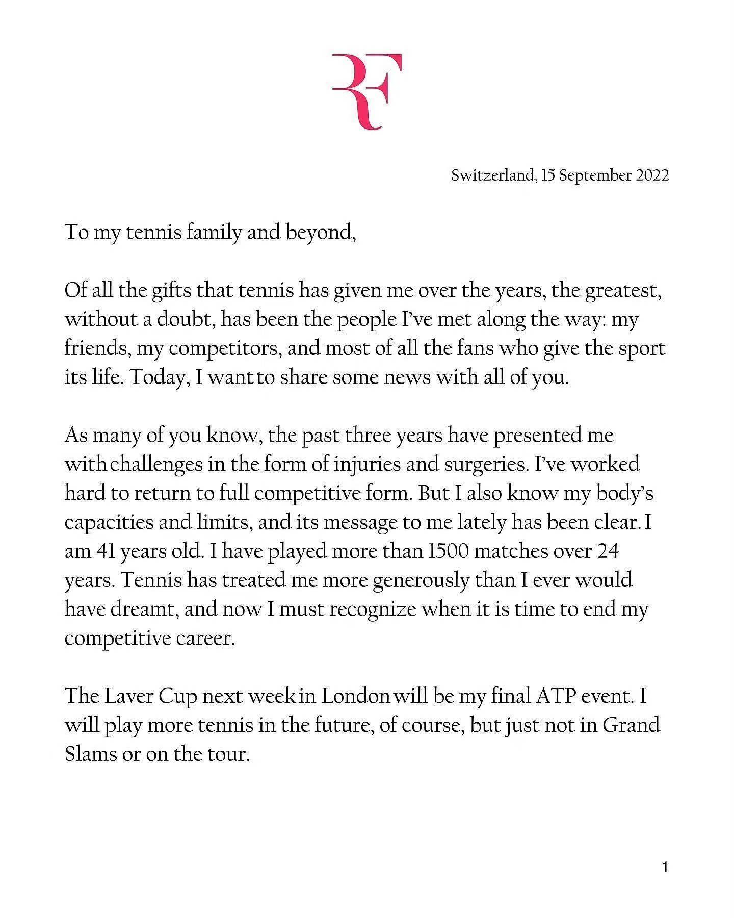 网坛名将费德勒于2022年9月15日宣布退役,如何看待?