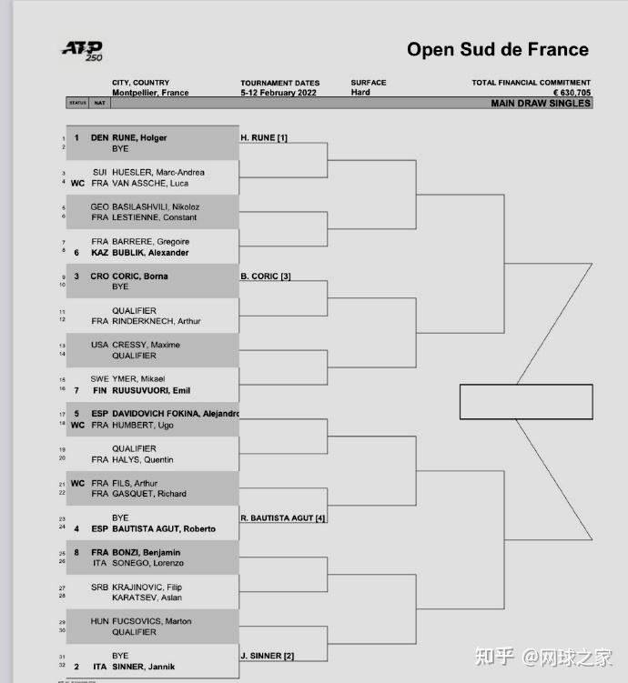 我们再来关注下周赛事。北京时间昨晚,ATP250法国蒙彼利埃站公布了男单正赛签表。头号种子、丹麦新星鲁内领衔出战,2-4号种子分别是意大利新星辛纳、克罗地亚名将丘里奇和西班牙名将阿古特。中国一哥张之臻将出战资格赛。