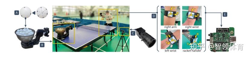设备配置如下图所示,将传感器放置在乒乓球拍的拍柄与运动员的肢体上以采集球的飞行速度与旋转速度。基于传感器采集到的数据,进一步结合数据推理模型推断得到运动员的击球位置与击球技术。随后,基于机器学习技术和乒乓球技战术理论设计了一个量化评估击球质量的模型。