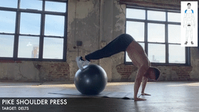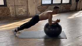 准备动作:双手合十将小臂置于瑜伽球上,双肩位于手腕正上方,撑起身体。