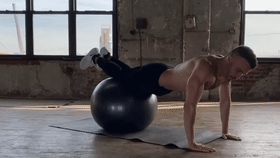 准备动作:双手撑地,肩膀在手腕正上方,双膝跪在瑜伽球上。