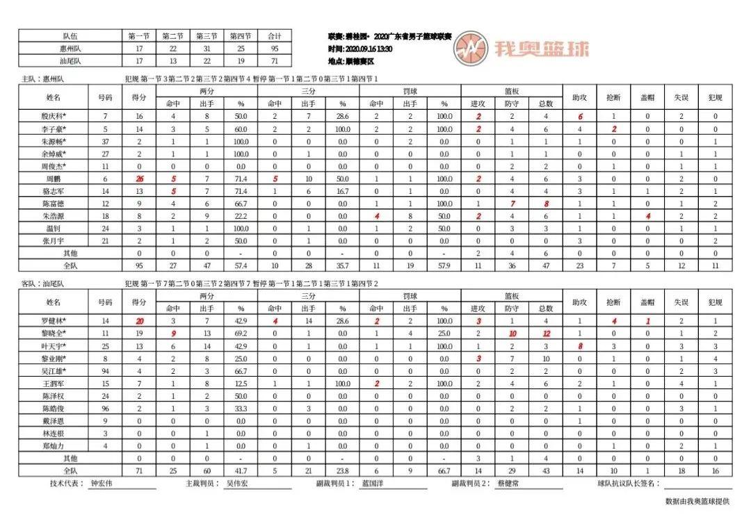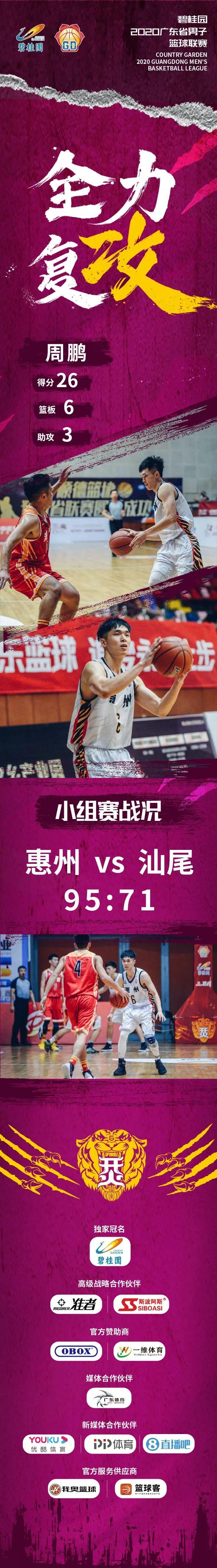 末节,汕尾连续抢断和快速的防守反击一度将比分拉进但惠州很快调整凭借快速移动和内线高度,频频得手比赛悬念也越来越小全场结束最终惠州以95:71夺得本场比赛的胜利但还是因战绩未能挺进八强附加赛