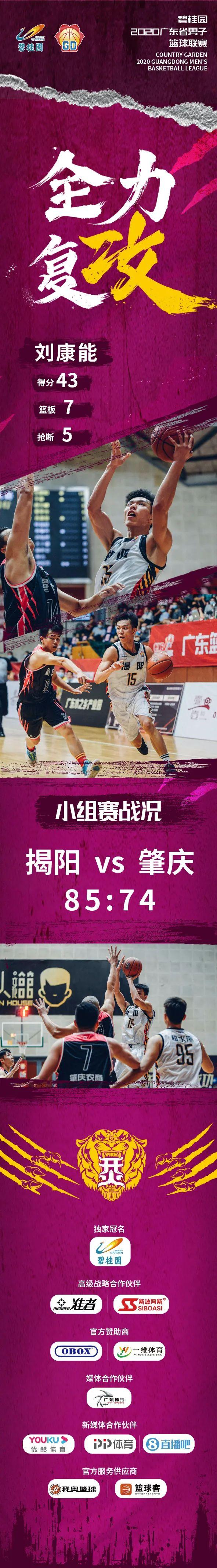 来到末节揭阳队刘康能、陈泽文两个得分手重新上场帮助揭阳队稳住领先优势虽然肇庆队文建阳内线依旧冲劲十足但是肇庆队同样无法限制揭阳队的速度双方分差僵持在了10分左右最终揭阳队成功守住优势以85:74战胜肇庆队,挺进八强附加赛