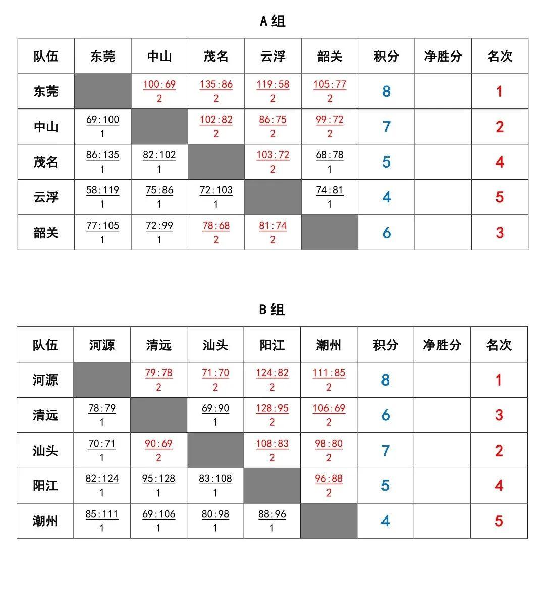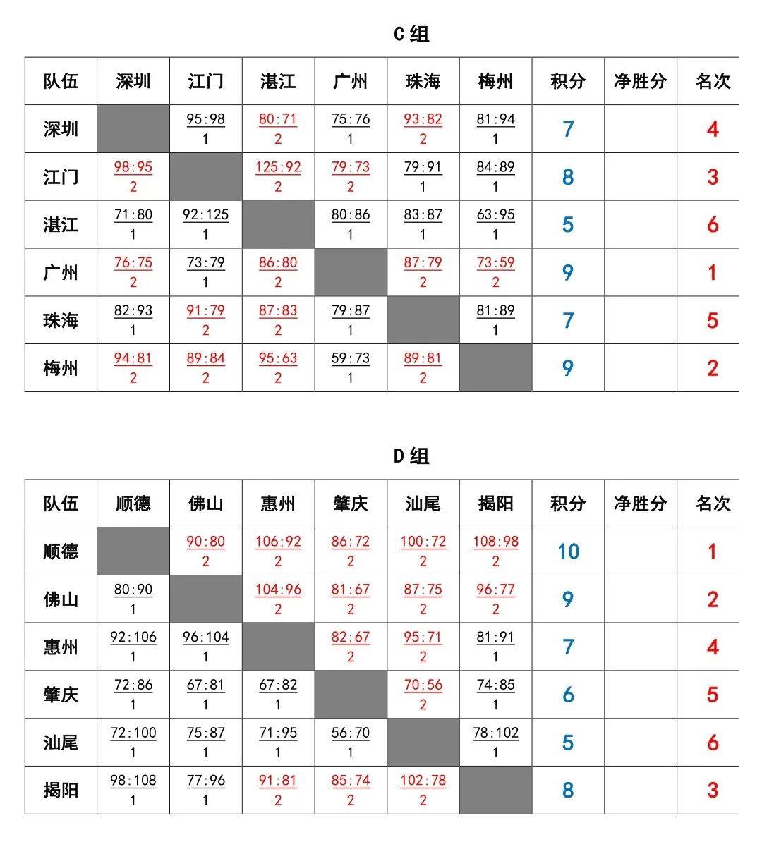 惠州队95:71汕尾队湛江队92:125江门金溪实业揭阳榕水湾85:74肇庆农商珠海免税集团81:89梅州机械技校中山锦恒木业69:100东莞三狼体育广州广汽集团76:75深圳队