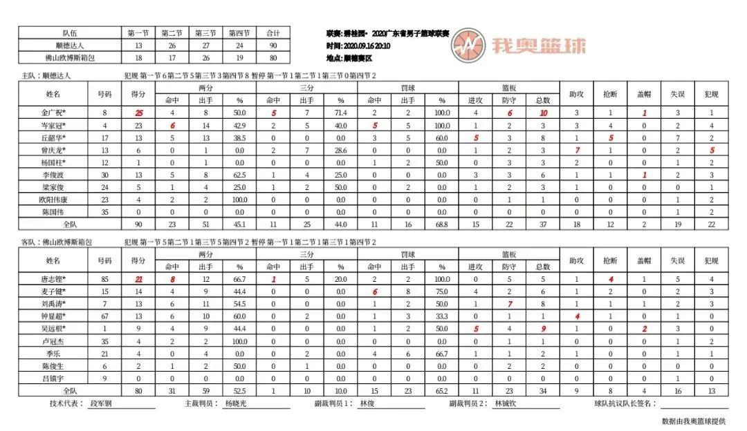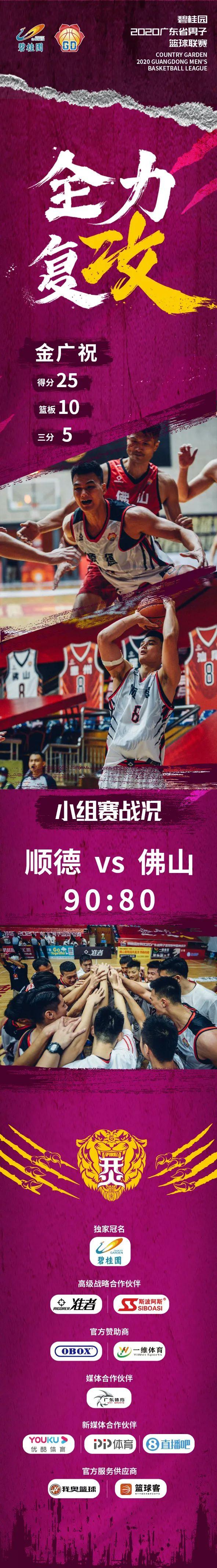 来到第四节,顺德队金广祝本场比赛三分投开后给佛山队造成了巨大的威胁内线防线被拉得更开这也给了岑家冠以及丘韶华突破的空间顺德队速度上优势也随着佛山队体力下降逐渐体现出来,接连突分打时间差在第四节成功扩大领先优势最终,顺德队在全场球迷的欢呼纳喊声中以90:80,10分的分差战胜佛山队以小组赛全胜姿态成功晋级8强