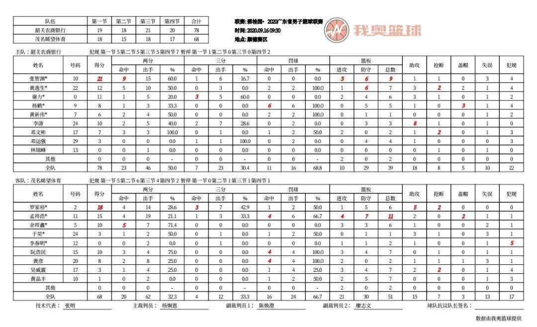 而茂名这边罗家裕、孟祥浩、余祥鑫、阮浩民四人得分上双其中孟祥浩更是拿下15分11个篮板