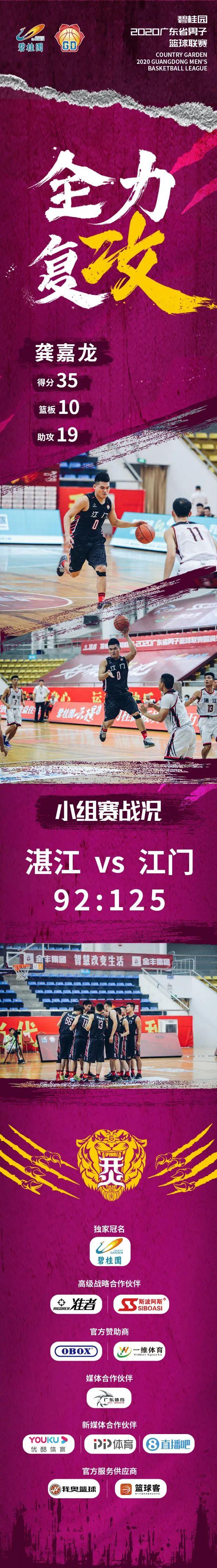 江门挺进八强附加赛文/鱼鳞江门金溪实业昨天对阵湛江队龚嘉龙砍下35分10篮板19助攻的三双数据帮助球队以125比92战胜湛江