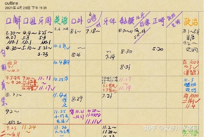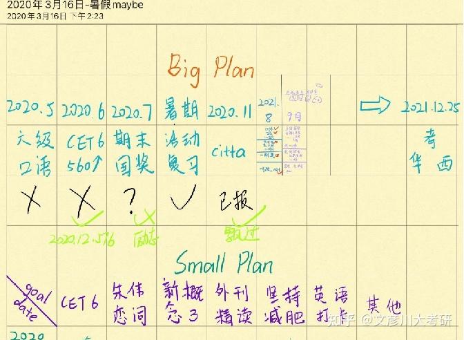 个人觉得在开始一段长时间的“战役”前,要先列大纲、plan,用notability的表格也很方便,或者季/月/周/日计划模板,我当时写的类似这样:(忽略丑字)打勾勾会有成就感!