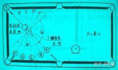 台球瞄准最基本的数学原理是所谓“半球法”,如图一所示,即正确的瞄准点(A点)在袋口中心点与目标球心连线的延长线上,与目标球中心距离一颗球 (也即与目标球表面接触点(B点)距离半颗球)。不论母球与目标球位置如何,即图中角α是多少度,击球时只要对准A点打,就一定能将目标球送进袋口(当然 α角一定要小于90度才行)。由于这一方法可以先假想有一个虚拟的台球与目标球刚好相切,且两球连线对准袋口,而瞄准点即为这一假想球的球心,因此这一方 法也称为“假想球法”。又由于瞄准点在袋口中心点与目标球心连线的延长线上,像是这条线长出了一截长度为半颗球的尾巴,因此也俗称“找尾巴”。