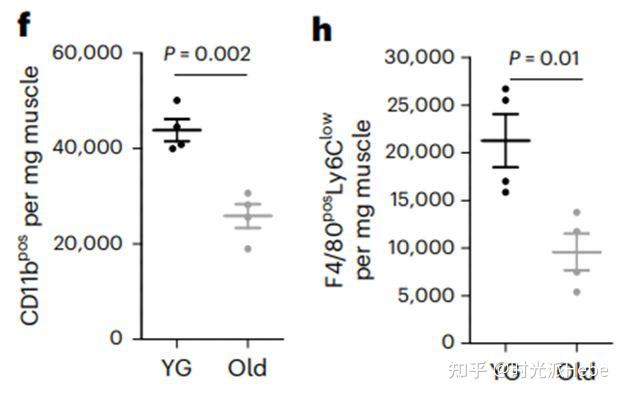 另外,小白的成体肌肉干细胞(MuSC)数量显著减少;骨髓细胞(CD11b pos)数量减少了65%,修复前巨噬细胞(F4/80 posLy6Clow)数量减少了82%。