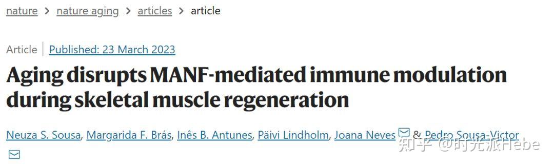 MANF负责促进巨噬细胞从促炎表型到修复表型的转变。本篇研究表明,衰老小鼠的MANF信号下调抑制巨噬细胞的这种表型转变,阻止巨噬细胞对损伤肌肉碎片的清除作用和肌肉干细胞的再生;相反地,若外源补充MANF则会促进衰老肌肉再生、调节炎症和组织稳态[3]。