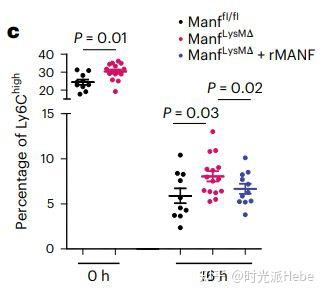 为此又设计了一种小鼠模型,这种小鼠和小白差不多,其巨噬细胞中的MANF也不表达,我们就暂时叫它小黑吧。研究者开发了一种离体测定法,跟踪小黑的促炎性巨噬细胞向修复前巨噬细胞的转变[3]。