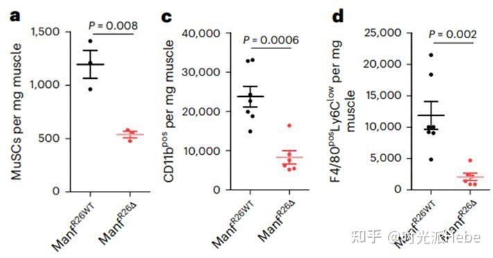 接下来,研究者又发现老年小鼠的MANF表达状况和小白非常相似!他们发现 23-25 个月大的老年小鼠MANF表达水平较年轻小鼠显著减弱,且骨骼肌内的骨髓细胞数量减少了41%修复前巨噬细胞的数量减少了55%[3]。