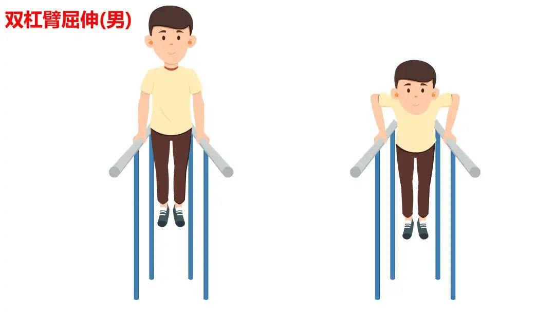 男生:引体向上、双杠臂屈伸、实心球、1分钟跳绳、原地纵跳摸高、立定跳远6选1;