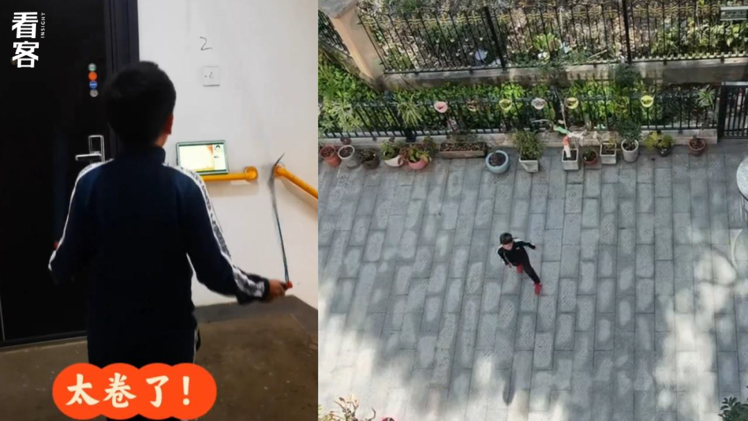 左:儿子在北京楼道跳绳 右:儿子在杭州院子踢球