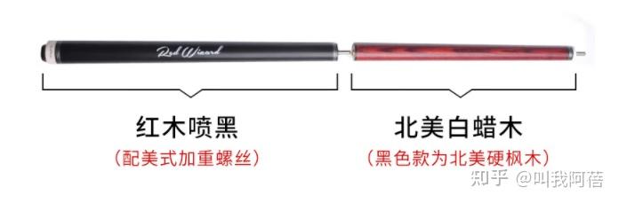 • 前节:大头杆(九球杆)多数用枫木,枫木韧性比较强,打旋球的时候更好用。小头杆(斯诺克杆)用白蜡木材质更多,因为白蜡木硬度高,击打远距离球时更稳定。