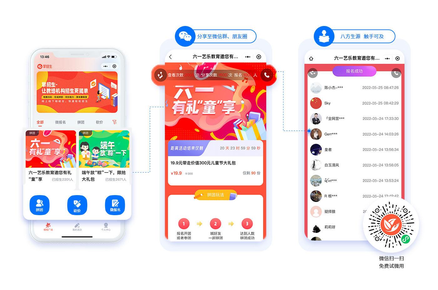 通过招生小程序则制作招生活动,转发朋友圈进行拓客,利用起校内资源进行社交营销,是几乎零成本的招生方式。校宇宙旗下招生小程序掌招生,内含百套招生活动模板,覆盖所有招生节点和节假日,三分钟完成一个招生活动策划和美工,一键转发朋友圈拓客。