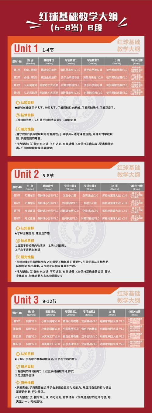 覆盖3-8岁高意向性年龄段教学;精灵网球课程针对3-5岁初学者(60分钟课程),红球基础课程针对6-8岁初学者(80分钟课程)。每段课程48节课,共96节课,覆盖2学年。