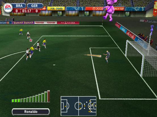 而在实况不断追求真实性的同时,FIFA依然在慢慢摸索自己对于足球游戏的具体定位,很多充满游戏性的设计曾经短暂出现,却又最终放弃。比如需要长时间按键的蓄力射门,又比如《FIFA2002世界杯》里的“飞火流星”特效。